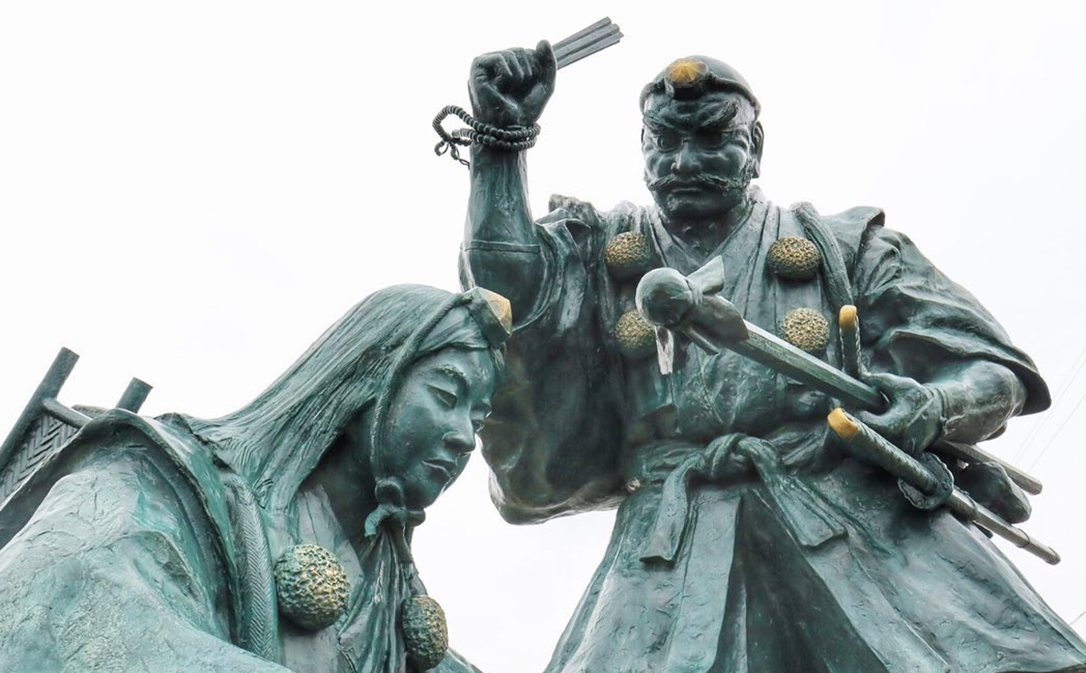 室町時代の『義経記』に、源義経が奥州に落ちのびる際に、渡守の平権守(たいらのごんのかみ)に「判官殿だ」と怪しまれるが、 弁慶が嫌疑を晴らすために扇で義経を打ちすえるという機転で切り抜け、無事に乗船できたという一節があり、この銅像は、源頼朝と不仲になり、奥州を目指す義経一行に義経ではないかと疑いを掛けられた時、弁慶のとっさの機転で疑念を晴らした一場面を語っています。